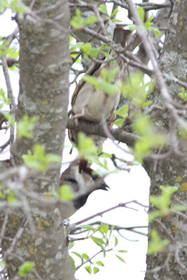 Then I heard what sounded like two birds fighting. When I located the birds, I couldn't believe my eyes! In a thicket was a bird holding onto a House Sparrow by the back of the head! The helpless bird just hung there